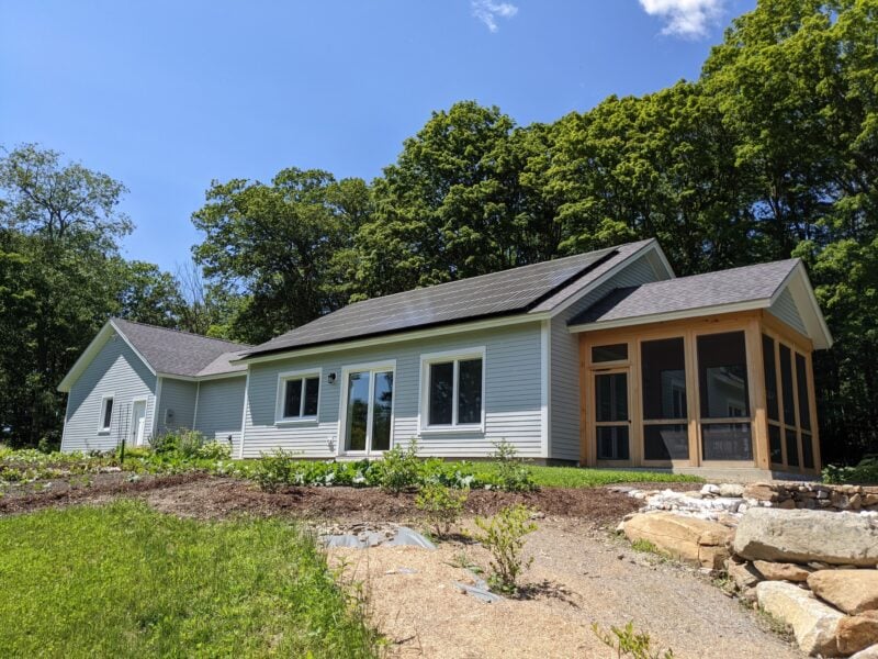 It was easy for Darryl and Pat to picture living in a Zum in the countryside; all they had to do was find a suitable building lot. That turned out to be a lovely property on a gravel road in Barnard, VT. Siting the home at the top of the gently sloping field with exposure to the south and west resulted in wonderful views from the Zum’s large windows, and it works well for the PV panels on the roof of the garage.